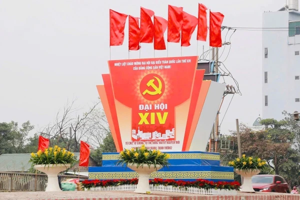 L'emblème de la faucille et du marteau, le drapeau du Parti et le drapeau national sont fièrement affichés au carrefour Dien Bien Phu–Doc Lap–Chu Van An à Hanoï pour commémorer le XIVe Congrès national du Parti communiste vietnamien. (Photo : VNA)